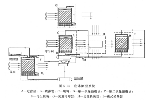 液體除濕系統整個液體除濕系統,如圖6-14所示,由除濕器、再生器、貯液罐、蒸發冷卻器組成。