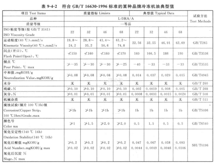 制冷壓縮機使用的潤滑油應符合國家標準或制冷壓縮機制造廠的要求,不同牌號的潤滑油,一般不宜混合使用,以防變質。表9-4-2為符合國標的某種品牌冷凍機油的典型參數值,選用時按壓縮機工況的發熱程度,以最惡劣壓縮發熱條件對應高黏度潤滑油為原則。