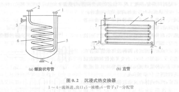 沉浸式熱交換器的管子常用直管(或稱蛇管)或螺旋狀彎管(或稱盤香管)組成傳熱面,將管子沉浸在液體的容器或池內,如圖0.2所示。這種熱交換器可用作液體的預熱器和蒸發器,也可用作氣體和液體的冷卻器或冷凝器。液槽內的液體體積大、流速低,因而管外液體中的傳熱以自然對流方式進行。整個液體的內部溫度一般等于或接近于液體的最終溫度,傳熱溫差不大,同時由于整個液體的體積大,就使這種熱交換器對于工況的改變不夠敏感。傳熱系數低、體積大是其根本弱點,然而它卻具有構造簡單,制作、修理方便和容易清洗等優點,因此現在仍有應用。由于更換管子方便,所以它還適用于有腐蝕性的流體。為了提高液槽側的換熱系數,也可在槽內裝攪拌器。如果流過管內的流體流量或所需傳熱面較大時,可以考慮做成幾圈同心的螺旋管或幾排并列的蛇管,以增加傳熱面。