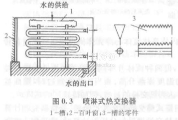 噴淋式熱交換器是將冷卻水直接噴淋到管外表面上,使管內的熱流體冷卻或冷凝,其結構如圖0.3所示。在上下排列著的管子之間,可借U形肘管連接在一起。為了分散噴淋水,在管組的上部裝設了帶鋸齒形邊緣的斜槽。也可用噴頭直接向排管噴淋。在熱交換器的下面設有水池,以收集流下來的水。