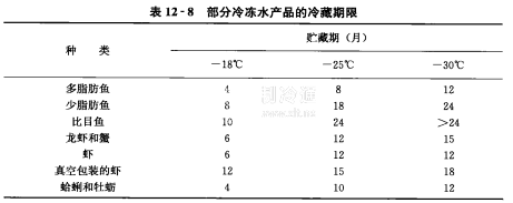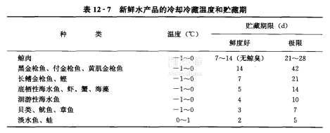常見新鮮水產品的冷卻冷藏溫度和貯藏期見表12-7.在冷卻冷藏時一般貯藏期限較短,適合短距離運輸或短時間貯藏。
