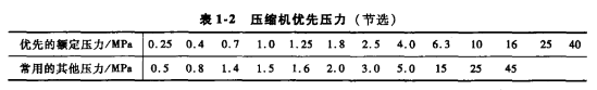 ①GB/T4974一2005《空壓機(jī)、鑿巖機(jī)械與氣動(dòng)工具優(yōu)先壓力》規(guī)定了壓縮機(jī)的優(yōu)先壓力,節(jié)選如表1-2所示,企業(yè)開(kāi)發(fā)和生產(chǎn)的產(chǎn)品應(yīng)按此標(biāo)準(zhǔn)來(lái)選取額定排氣壓力。