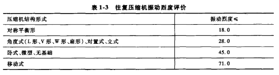 目前,現(xiàn)行有效的壓縮機(jī)振動(dòng)測(cè)量與評(píng)價(jià)標(biāo)準(zhǔn)僅有一個(gè)(GB/T7777一2003《容積式壓縮機(jī)機(jī)械振動(dòng)測(cè)量與評(píng)價(jià)》),只適用于往復(fù)活塞式壓縮機(jī)。該標(biāo)準(zhǔn)是通過(guò)測(cè)量壓縮機(jī)本體外表面不同高度上、不同方向(X、Y、Z三方向)的振動(dòng)速度有效值,然后取最大值作為振動(dòng)烈度的評(píng)價(jià)值。各類往復(fù)壓縮機(jī)振動(dòng)烈度評(píng)價(jià)要求如表1-3所示。