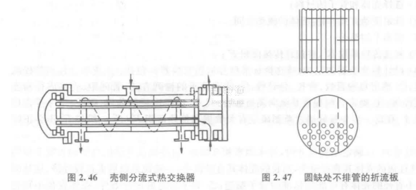 如果把原來位于殼體兩端的單進、出口(流體繞過折流板一次流過殼體)改成進口在中間、出口在兩端的分流式熱交換器,將流體分成兩半從殼體任一端流出,如圖2.46所示那樣,可以大大降低橫流速度。