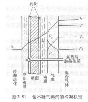 含不凝氣蒸汽的冷凝蒸汽中所含不凝結性氣體可能有兩個不同的來源,一是由于外部漏入,二是由于冷凝物質所固有或夾帶。當蒸汽中含有不凝氣時,傳熱過程實際上是由蒸汽的冷凝和不凝氣的冷卻共同組成,這一過程叫做冷凝一冷卻過程。