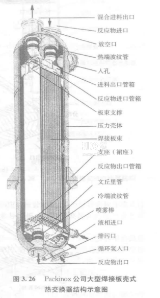 圖3.26所示為用于煉油重整裝置中的重整F/F熱交換器,一臺(tái)Packinox公司制造的大型焊接板殼式熱交換器,該熱交換器主要由一個(gè)壓力殼和一個(gè)吊掛在壓力殼體中的全焊式板束組成。冷熱介質(zhì)通過(guò)板束,在板束內(nèi)進(jìn)行純逆流換熱。在板束與殼體接管之間,采用波紋管膨脹節(jié)來(lái)補(bǔ)償不銹鋼板束與低合金鋼殼體之間的熱膨脹差,殼體內(nèi)沒(méi)有環(huán)流,在板束與殼體之間充滿(mǎn)循環(huán)氫氣(冷介質(zhì))以平衡壓力。由于冷介質(zhì)壓力一般高于熱介質(zhì),通人冷介質(zhì)后,避免了熱介質(zhì)與殼體的接觸