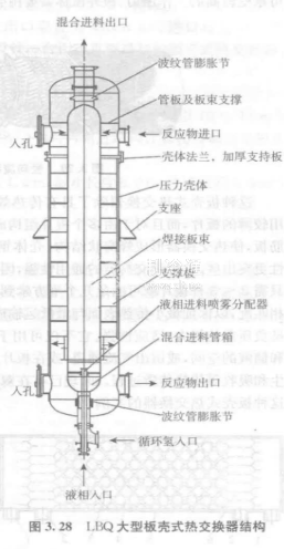 國產LBQ大型板殼式熱交換器圖3.28是蘭州石油機械研究所開發的LBQ大型板殼式重整進料/產物熱交換器的典型設計結構之一,粗汽油和循環氫(冷流介質)從熱交換器底部中心接管分別送人并在混合進料管內混合后進入板束“板程”,經與熱流介質換熱后從熱交換器頂部流出,反應產物(熱流介質)則從熱交換器上部側面開口進入殼體,然后從加厚支持板上方的板束兩側進口進人板束“殼程”,經由冷流介質換熱后從板束下方設備兩側出口流出,冷熱介質在板束中為“全逆流”換熱。