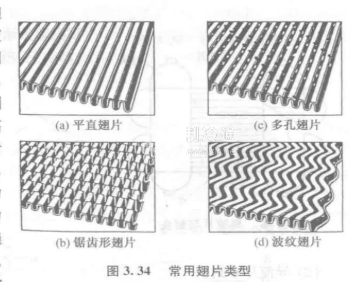 出許多圓孔或方孔而成的(圖3.34(c))。多孔翅片開孔率一股在5%一16之間,孔徑與孔距無一定關系,孔的排列有長方形、平行四邊形和正三角形三種,我國目前采用的多孔翅片,孔徑為2.15、1.7,孔距為6.5mm、3.25mm,正三角形排列。翅片上的孔使傳熱邊界層不斷破裂、更新,提高了傳熱效率。它在雷諾數比較大的范圍內(10一10)具有比平直翅片高的換熱系數,但在高雷諾數范圍會出現噪音和振動。翅片上開孔能使流體在翅片中分布更加均勻,這對于流體中雜質顆粒的沖刷排除是有利的。多孔翅片主要用于導流片及流體中夾雜顆粒或相變換熱的場合