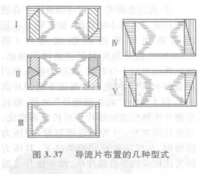 對各種結(jié)構(gòu)型式的板翅式熱交換器,導流片可布置成如圖3.37所示的幾種型式。圖中1型主要是由于在熱交換器的端部有兩個以上的封頭,因此要用導流片把流體引導到端部一側(cè)的封頭內(nèi)。Ⅱ型布置是由于在熱交換器端部有三個以上的封頭,需要把一股流體引導到中間封頭內(nèi)