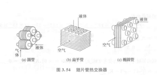 翅片管是翅片管熱交換器中的主要換熱元件,翅片管由基管和翅片組合而成,基管通常為圓管【圖3.54(a)】,也有扁平管【圖3.54(b)】和橢圓管【圖3.54(c)】.管內、外流體通過管壁及翅片進行熱交換,由于翅片擴大了傳熱面積,使換熱得以改善。翅片類型多種多樣,翅片可以各自加在每根單管上【圖3.54(a)】,也可以同時與數根管子相連接【圖3.54(b)及(c)】