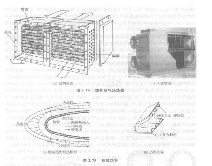 (2)熱管空氣預(yù)熱器熱管空氣預(yù)熱器在余熱回收、電站鍋爐等方面使用較廣。圖3.74所示為熱管空氣預(yù)熱器的一種典型結(jié)構(gòu),它由熱管管束、外殼和隔板組成。隔板用來將熱管的蒸發(fā)段和凝結(jié)段隔開,以保證相應(yīng)于蒸發(fā)段與凝結(jié)段的管外通道分別流過熱氣體與冷氣體(空氣)。熱管的外壁加有