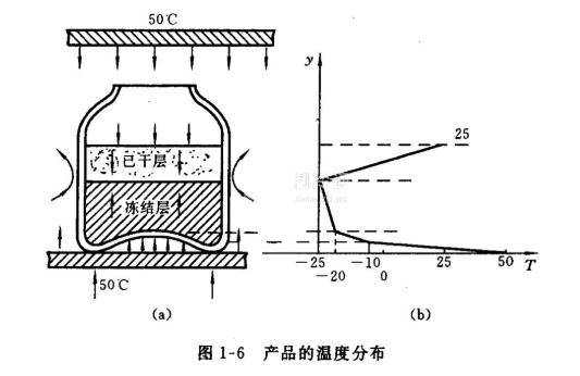 由于傳熱中必須有傳熱溫差,且各段傳熱溫差與其相應(yīng)熱阻成正比,所以產(chǎn)品中形成了圖1-6(b)所示的溫度分布。例如,擱板表面溫度為50℃,到升華界面的溫度約為一25℃,冰層最高溫度約為一20℃,干燥層上表面溫度可能為25℃。