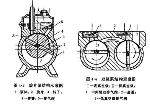 圖4-3所示為單級旋片真空泵的結(jié)構(gòu)圖。它主要由定子、轉(zhuǎn)子和旋片組成。轉(zhuǎn)子偏心地安裝在定子內(nèi),轉(zhuǎn)子槽中裝有兩旋片,兩旋片靠中間的彈簧力和旋轉(zhuǎn)時的離心力緊貼于泵腔內(nèi)壁,將泵腔與轉(zhuǎn)子之間的月牙形空間分成三(或二)部分。從進氣管到旋片分隔的空間稱吸氣空間:兩旋片之間稱為膨脹壓縮空間;與排氣口
