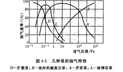 羅茨真空泵凍干機的工作壓力一般在4~130Pa范圍。而在這個壓力范圍,油封機械真空泵要獲得大的抽速,必須增大系的尺寸和提高轉速。但這給制造技術帶來很多困難。在此范圍內采用蒸氣流泵要獲得大的抽速也是很不經濟的,因為泵的功率要大大增加。而羅茨真空泵在此壓力范圍內卻能很好地工作(圖4-5),所以很多凍千機采用羅茨泵作為主泵。