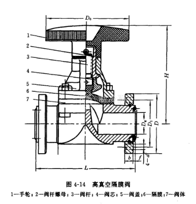隔膜真空閥圖414所示的為隔膜真空閥的結(jié)構(gòu)圖。它主要由閥體、隔膜、閥桿和手輪組成。