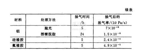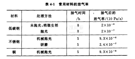 放氣率是指氣體從置于真空系統中的材料上自然而然地釋放出來的速率。常用材料的放氣率如表4-1所示。