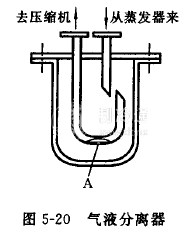 氣液分離器的結構如圖5-20所示。從蒸發器出來的回氣由分離器的進氣口進入分離器,由于氣流速度的減小和氣流方向的改變,使氣流中的液滴分離出來并聚積于容器底部,通過容器壁吸收環境的熱量而氣化,再從出口被壓縮機抽走。當集液高度超過壓縮機抽氣管上的小孔A時,由于管內氣流速度高,故壓力比管外小,液體或液面上的油就會在此壓差作用下,通過小孔噴射霧化帶回壓縮機吸氣口。
