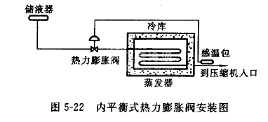 圖5-22示出了內平衡式熱力膨脹閥的安裝圖。感溫包被綁在蒸發(fā)器出口管路上,當膨脹閥的供液量相對于蒸發(fā)器熱負荷較小時,蒸發(fā)器出口的過熱度增大,因而感溫包中氣體的壓力增高,使膜片向下彎曲,通過傳動桿推動閥芯向下運動,開大閥孔通流面積,使供液量增大。當供液量相對于蒸發(fā)器熱負荷較大時,其出口處過熱度減小,感溫包和膜片上方的壓力減小,彈簧則推動閥芯和傳動桿向上運動,使膜片在新的位置下處于平衡,閥芯則關小了閥孔通道,減少了供液量。由此可見,熱力膨脹閥是靠蒸發(fā)器出口制冷工質的過熱度來自動調節(jié)供液量的。