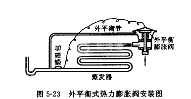 對于蛇管管道較長或蒸發(fā)溫度較低的蒸發(fā)器,由于管內阻力損失較大,造成制冷劑蒸發(fā)完畢時的飽和壓力和溫度比進口處的降低較多,感溫包處要達到原來設定的溫度,就需有更長的蒸發(fā)管路作蒸氣過熱用,因而蒸發(fā)器的效率降低。為了克服這一缺點,必須采用如圖5-21(b)所示的外平衡式熱力膨脹閥。外平衡式熱力膨脹閥與內平衡式熱力膨脹閥不同在于膜片下方不與蒸發(fā)器進口處的制冷工質相通,而是用一外平衡管使之與蒸發(fā)器出口處的制冷工質相通(圖5-23),這樣膜片下方的壓力將不受蒸發(fā)盤管內流動阻力損失的影響,但此種膨脹閥的結構和安裝都比較復雜。