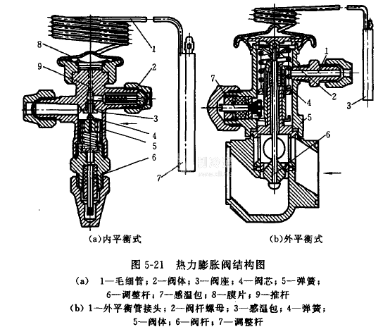 結構原理圖5-21所示的為內平衡式和外平衡式熱力膨脹閥的結構圖,它主要由感溫包、毛細管、感應薄膜、閥座、閥針、彈簧、調節(jié)桿、閥體等組成。感溫包內充注有制冷劑或其他介質的液體,其壓力由感溫包的溫度所決定。感溫包用毛細管與感應薄膜的上部空腔相