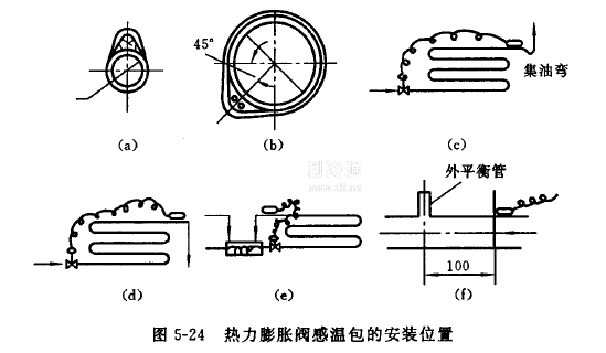 ③外平衡管的接口一般安裝在感溫包后100mm處,且應(yīng)從回氣管頂部引出,以免油進(jìn)人閥內(nèi)(圖5-24())。