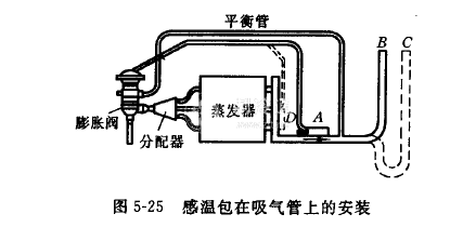 感溫包不可安放在受冷、熱氣流影響的地方,任何情況下也不能安裝在有積液的吸氣管處,以免造成閥的誤動作。如圖5-25所示,若回氣管為B,則A處可能積液積油,若必須安裝在A處,就需將吸氣管改成C的形狀,使液、油存積于彎管處;若管路不能改動,則寧可將感溫包安裝在D處。