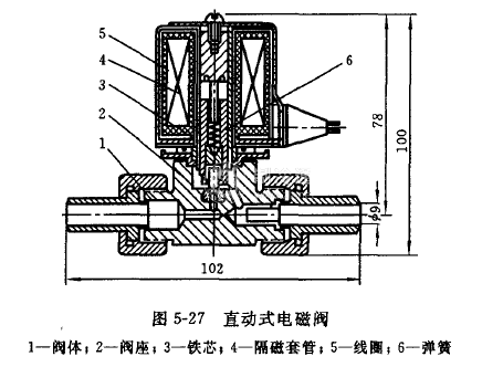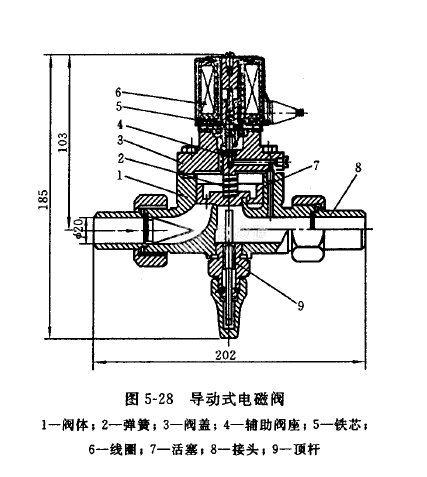 電磁閥是一種開關式自動閥門,可由壓力控制器、溫度控制器、液位控制器等通過電氣元件進行控制。它適用于各種制冷劑和載冷劑。電磁閥的結構如圖5-27所示,主要由外殼、線圈、鐵芯、膜片式活塞、閥體、密封環(huán)等組成。就其動作過程來說,基本上有兩種類型,一為直動式,一為導動式。圖5-27所示的為直動式,當電源接通時,線圈產生磁場,吸起鐵芯,閥門打開,流入端與流出端相通;當電源切斷后,磁場消失,鐵芯因彈簧力和自重而落下,關閉閥門。圖5-28所示的為導動式,當線圈6通電時,吸起鐵芯5,將小閥口4打開,使活塞7的上部空間與閥后低壓工質相通,活塞上腔減壓,由于活塞下方與閥前高壓端相通,活塞會因上下壓差而升起,閥被打開;當電源切斷后,鐵芯由于彈簧力和自重而下落,關小閥口。由于活塞體上有1的平衡孔而使活塞的上下腔壓力平衡,活塞會因彈簧力和自重而下落,關閉閥門。這種閥門工質流動時有壓力損失,閥全開時壓力損失約為0.14×105Pa。
