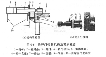 氣動(dòng)插銷式快開門鎖緊機(jī)構(gòu)圖6-6所示的是氣動(dòng)插銷式快開門鎖緊機(jī)構(gòu)的一種,圖(a)所示的為機(jī)構(gòu)示意圖,圖(b)所示的為快開門機(jī)構(gòu),關(guān)門時(shí)先將門貼在箱口上略作壓緊,而后抽真空,使密封條產(chǎn)生必要的變形,當(dāng)變形達(dá)到要求后,用壓縮空氣推動(dòng)活塞,將銷栓穿入箱體鎖環(huán)5和箱門鎖環(huán)4.這樣門被鎖緊,在一個(gè)凍干箱上,按照箱口的大小,將這種鎖栓沿箱口周邊安裝多個(gè)。