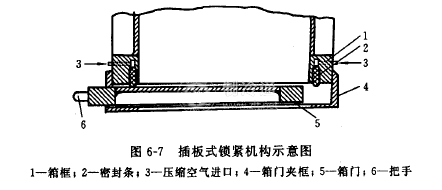 插板式鎖緊機(jī)構(gòu)圖6-7示出了一種插板式鎖緊機(jī)構(gòu),它也可用在帶SIP系統(tǒng)的凍干機(jī)中。在箱口四周焊一箱門(mén)夾框,將門(mén)由夾框的一側(cè)推入夾框之中,將壓縮空氣通人箱口密封槽底部,將密封條推出,緊緊壓在箱門(mén)上,使箱體與箱門(mén)間嚴(yán)密密封,這種形式結(jié)構(gòu)簡(jiǎn)單、可靠,可以自動(dòng),也可以手動(dòng)。