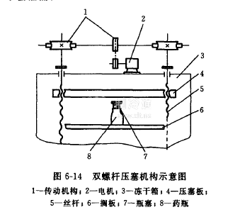 雙螺桿壓塞機(jī)構(gòu)圖6-14示出了雙螺桿壓塞機(jī)構(gòu)的示意圖。在凍干箱內(nèi)兩側(cè)有兩根豎直平行的螺桿,它們由安裝在箱體上部的電機(jī)驅(qū)動(dòng)而轉(zhuǎn)動(dòng),通過螺母帶動(dòng)壓塞板上下運(yùn)動(dòng),完成壓塞動(dòng)作。螺桿與箱體間有密封,不會(huì)泄漏。