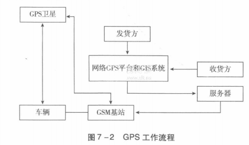 當物流公司送出貨物后,將提貨單和密碼交給收貨方,并將貨單輸入網絡GPS平臺中,同時輸入貨單與貨物載運車輛信息;載運車輛(裝有GPS接收機)在運輸途中實時接收GPS衛星定位數據后,自動計算出自身所處的地理位置的坐標,后經GSM通信機發送到GSM公用數字移動通信網,并通過DDN專線將數據發送到網絡GPS監控平臺上,中心處理機將收到的坐標數據以及其他數據還原后,與GS系統的電子地圖相匹配,并在電子地圖上直觀地顯示車輛實時坐標的準確位置。各網絡GPS用戶可用自己的權限上網進行自有車輛信息的收發、查詢,在電子地圖上清楚而直觀地掌握車輛的動態信息(位置、狀態、行駛速度等),同時還可以在車輛遇險或出現意外事故時進行種種必要的遙控操作。網絡GS系統工作流程如圖7-2所示。