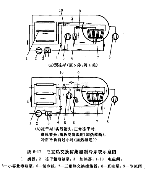 ①制品預凍時,如圖6-17(a)所示,加熱器3斷電,制冷機6給三重熱交換捕集器7供冷,冷卻后的溶液由凍干箱的溶液泵2抽出,沿箭頭方向進入擱板,使制品降溫、凍結,出擱板后沿箭頭方向又進入三重熱交換器。