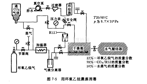 Pa,放人無菌空氣到9.70×10Pa,再抽空到極限真空。抽出的氣體必須排到室外。熏蒸完后打開箱門,通無菌空氣約4h。其系統(tǒng)如圖7-5所示。環(huán)氧乙烷滅菌比較便宜,所需溫度低,能耗較少,主要缺點(diǎn)是有毒,易燃燒爆炸,在不帶熱濕蒸氣滅菌的凍干機(jī)中使用。