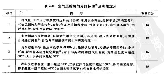 一、空氣壓縮機的完好標準及考核定分如表2-8所示。