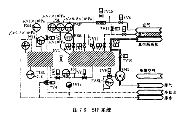 SIP系統(tǒng)如圖7-6所示,它是在凍干機原有設(shè)備的基礎(chǔ)上加一些管道、閥門、壓力控制器和溫度控制器等。圖中蒸氣系統(tǒng)是給冷阱、空氣過濾器和凍干箱輸送滅菌蒸氣的;7V14為疏水閥,防止排水時將蒸氣放出;箱體上的壓力傳感器控制箱內(nèi)壓力必須小于大氣壓才能打開門鎖;行程開關(guān)控制門鎖到位才能打開進蒸氣閥;冷阱上有幾個壓力傳感器,在箱(冷阱)內(nèi)壓力超過第一、第二設(shè)定值時關(guān)閉蒸氣閥發(fā)出報警信號,若壓力達(dá)到第三設(shè)定值則打開安全閥放氣泄壓并報警;箱底和箱內(nèi)、冷阱內(nèi)均有溫度測點以測量最冷點和其他測溫點的溫度;水環(huán)泵7M1用來在滅菌前和升溫中抽真空,滅菌后抽空冷卻和干燥箱體及冷阱;冷卻水系統(tǒng)在滅菌結(jié)束后給冷阱、凍干箱壁面降溫;放空氣系統(tǒng)用于滅菌后充空氣;旁通閥7V15用于保護空氣過濾器兩端壓差不超過允許值,以免損壞過濾器。