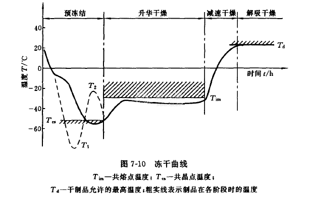 凍干曲線的形狀與制品的性能、裝量的多少、分裝容器的種類、凍干機的性能等諸多因素有關。即使同一制品,生產(chǎn)廠家不同,其凍干曲線亦不完全一樣。因此應根據(jù)各自的具體條件,用試驗制定出最佳的凍干曲線。