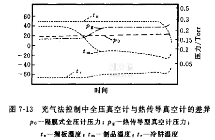 ①熱傳導(dǎo)真空計(jì)的標(biāo)度與氣體成分有關(guān),空氣進(jìn)入箱內(nèi)后,其氣體成分不斷變化,特別是解吸干燥階段與升華階段箱內(nèi)氣體成分差別較大,引起較大的測量誤差(圖7-13中p。和.)。