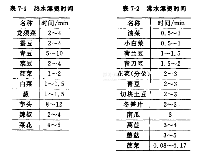 在切分時,常發(fā)生酶促褐變,在制品儲存中也將引起褐變,所以需要滅酶或殺青,也即將食品在93100℃的熱水(或蒸氣)中熱燙數(shù)分鐘,使酶的活性鈍化。熱燙的溫度和時間,因果蔬的種類尺寸大小不同而異。一些蔬菜的漂燙參考時間如表7-1、表7-2所示。