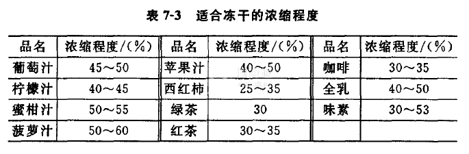 60%再凍干。濃縮可采用真空低溫濃縮。某些汁液的濃縮程度如表7-3所示。