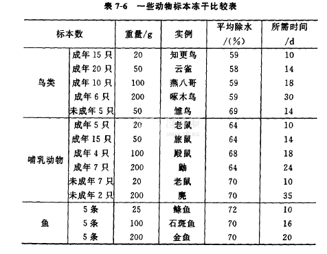 表7-6中的動(dòng)物標(biāo)本是在隔熱板內(nèi)部空間尺寸為直徑300mm、長(zhǎng)456mm,內(nèi)部平均溫度為-15℃的條件下進(jìn)行干燥的。