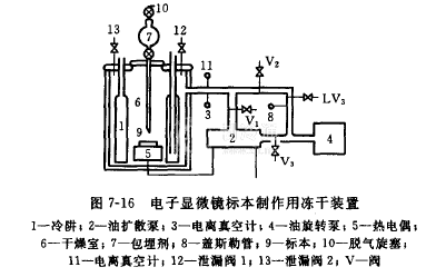 制作組織標本的凍干裝置與通常的凍干裝置不同,必須能進行一些特殊的操作。例如,必須有阻止干燥室內試料溫度上升的冷卻裝置,必須能在真空中包埋試料,因而應備有預先排了氣的包埋劑及裝包埋劑的容器。為了提高低溫干燥效率,應設法采用液氮作冷阱的冷源等。圖7-16所示的為電子顯微鏡標本制作用凍干裝置。