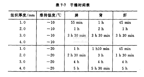 (2)于燥在預先冷卻到一50℃以下的試料臺上,移動凍結試料,迅速抽真空排氣開始干燥。干燥過程中,試料的溫度希望低于再結晶或抑制冰晶生長的溫度。但從冰的蒸氣壓來看,在10~3Pa的真空中,溫度在一90℃以下,冰無法升華,即使在一80℃左右,也被認為是極限升華溫度,因此生物組織凍干時一般將制品冷卻到一70℃左右。至于試料溫度和干燥速率的關系,用斯梯芬森圖表示。從該圖可知,隨升華溫度的降低干燥時間急劇增加。