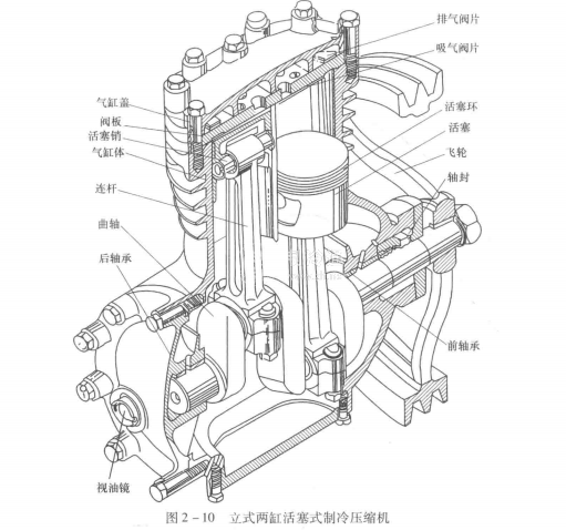 各種活塞式制冷壓縮機的制冷量、外形、制冷劑、用途等不盡相同,但其基本結構和組成的主要零部件都大體相同,即包括機體、曲軸、連桿組件、活塞組件、吸排氣組件、氣缸套組件等。圖2-10即為一臺立式兩缸活塞曲柄連桿式制冷壓縮機的結構圖。
