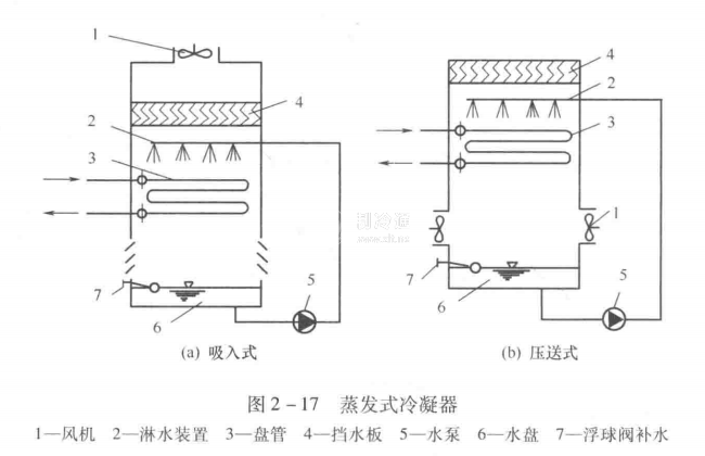 圖2-17(a)、(b)是吸入式和壓送式蒸發式冷凝器。這兩種結構形式的冷凝器都裝有蛇形盤管的傳熱面,管內走制冷劑,管外噴淋循環水,水吸收冷凝熱而蒸發,而空氣自下而上掠過盤管,促進水蒸發,并帶走蒸發的水分。上部設有擋水板,除掉未蒸發的水滴。風機安裝在上部,冷凝盤管位于風機吸氣端的是吸入式蒸發式冷凝器。吸入式由于空氣均勻地通過冷凝盤管,所以傳熱效果好,但風機電機的工作條件惡劣,它在高溫高濕條件下運行,易發生故障。風機安裝在下部,冷凝盤管位于風機壓出端的是壓送式蒸發式冷凝器,風機電機的工作條件好,但空氣通過冷凝盤管不太均勻。
