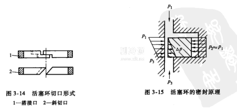 為了防止氣缸中的氣體從壓力較高的一端漏至壓力較低的一端,在活塞上裝有活塞環(huán)。活塞環(huán)在自由狀態(tài)時,其直徑稍大于氣缸直徑。裝人氣缸后,由于活塞環(huán)有切口,所以靠其本身的彈性,使環(huán)與氣缸壁緊密貼合。活塞環(huán)裝入活塞環(huán)槽內(nèi),與槽壁有一定間隙。活塞環(huán)數(shù)目隨活塞前后壓力差而異,壓力差愈大,活塞環(huán)愈多。活塞環(huán)的切口形式如圖3-14所示,斜開口用于直徑不大的活塞環(huán),搭接口用于大直徑的活塞環(huán)。