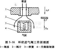 氣閥是壓縮機(jī)的重要部件之一。它的好壞直接影響排氣量、排氣壓力和運行的可靠性。氣閥的開啟與關(guān)閉是靠活塞在吸氣、排氣過程中,在閥片兩邊造成的壓力差自動動作的。環(huán)狀進(jìn)氣閥的工作原理如圖3-16所示。