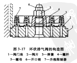 圖3-17為環(huán)狀排氣閥結(jié)構(gòu)圖,主要由閥門座1、閥片2、彈簧3、螺桿4、螺母5、開口銷6、升程限制器7等組成。