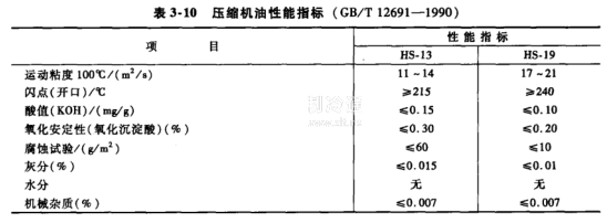 (2)潤滑油的選擇壓縮機氣缸用潤滑油的選擇如表3-9所示。壓縮機油的性能指標如表3-10所示。