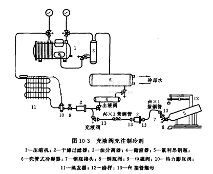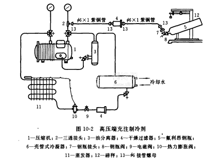 高壓端充注如圖10-2所示。高壓端充注是充注制冷劑的液體,充注速度快且安全,適用于較大的制冷系統。充注方法如下。