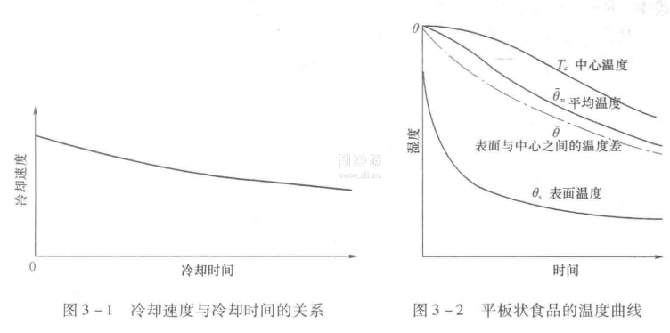 食品的冷卻速度就是食品溫度下降的速度。由于食品內(nèi)各部位不同,在冷卻過程中溫度下降的速度也不同,整個(gè)食品的冷卻速度只能以平均溫度下降速度來表示。食品的冷卻時(shí)間與其冷卻速度有著密切關(guān)系。當(dāng)食品的溫度隨著時(shí)間的延長(zhǎng)而逐漸降低時(shí),它與冷卻介質(zhì)之間的溫差也逐漸減小,食品的冷卻速度也就減慢。所以食品的冷卻速度是隨著時(shí)間而變化的。圖3-1為食品冷卻速度與冷卻時(shí)間的關(guān)系曲線圖。